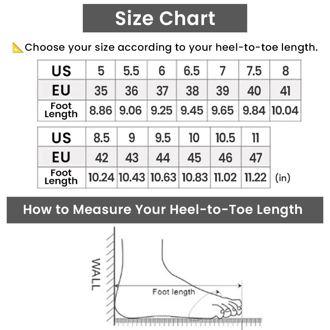 Measure your heel-to-toe length, then refer to the size chart. If you fall between sizes, consider the width of the shoe and whether you will wear thick socks.